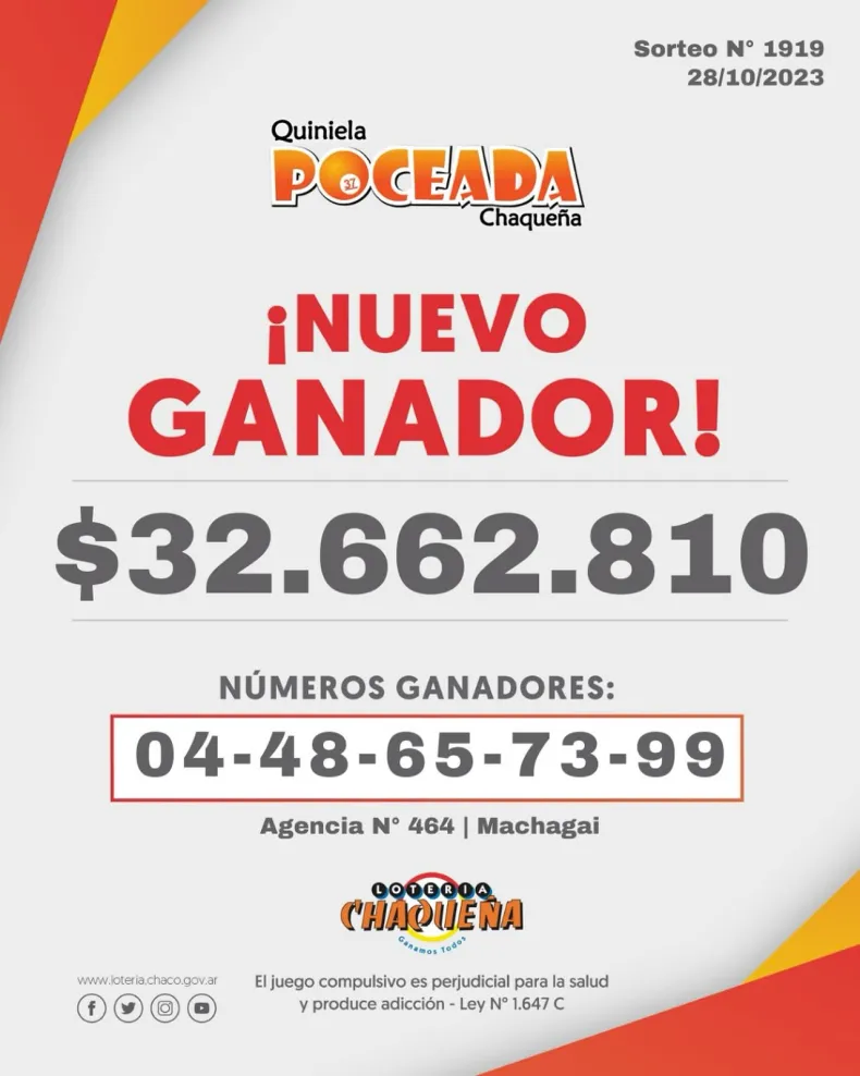 Se trató del sorteo número 1919 de la Poceada Chaqueña y en esta ocasión el ganador recibió un total de $ 32.662.810.
