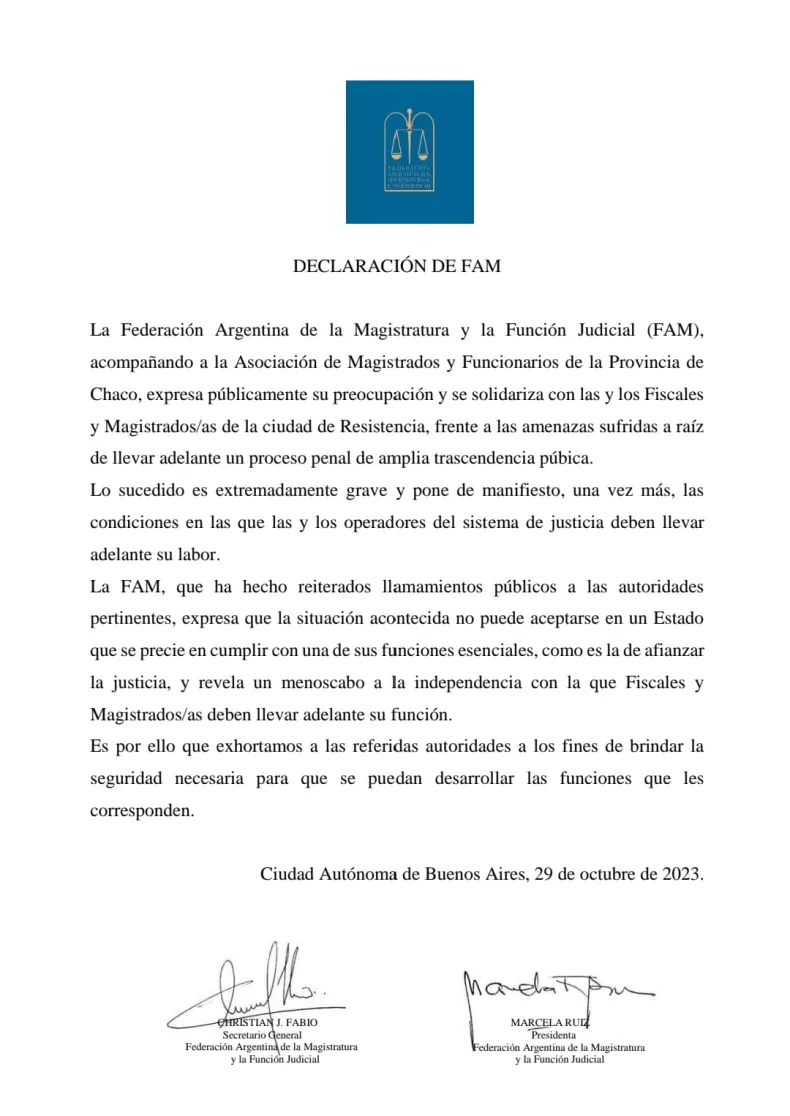 La Federación Argentina de la Magistratura y la Función Judicial (FAM) emitió un comunicado este domingo rechazando las amenazas e intimidaciones contra jueces y fiscales que llevan adelante la investigación por el femicidio de Cecilia Strzyzowski.
