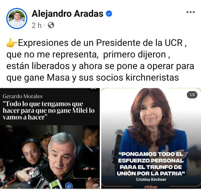 En torno a lo local, el candidato a la presidencia del concejo de Resistencia y diputado provincial, Alejandro Aradas expuso en sus redes sociales que: "expresiones de un presidente de la UCR, que no me representan, primero dijeron están liberados y ahora se ponen a operar para que gane Massa y sus socios kirchneristas".