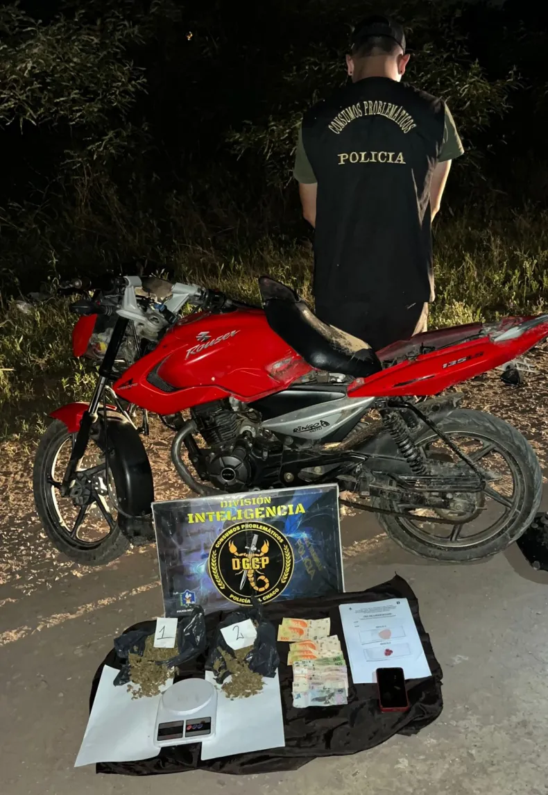 El mismo, tiene 28 años y debajo del asiento de su motocicleta Bajaj, modelo Rouser de 135 cilindradas transportaba dos envoltorios de polietileno, conteniendo un total de 255 gramos marihuana. A su vez, también se secuestró dinero en efectivo.