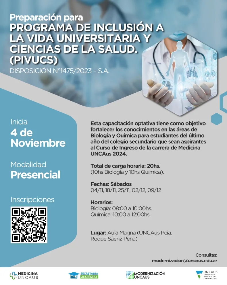 La Universidad Nacional del Chaco Austral informa que el día sábado 04 de noviembre comenzará el dictado del "Programa de Inclusión a la Vida Universitaria y Ciencias de la Salud (P.I.V.U.C.S.)", destinado a aquellas personas que deseen estudiar la carrera de Medicina en la institución, en el año 2024. Los mismos son de carácter optativos.