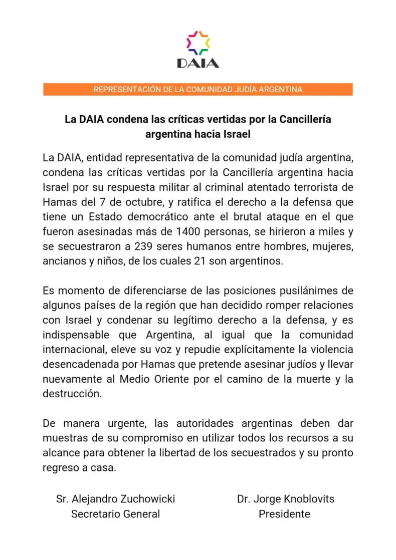 La DAIA, entidad representativa de la comunidad judía argentina, condena las críticas vertidas por la Cancillería argentina hacia Israel por su respuesta militar al criminal atentado terrorista de Hamas del 7 de octubre, y ratifica el derecho a la defensa que tiene un Estado democrático ante el brutal ataque en el que fueron asesinadas más de 1400 personas, se hirieron a miles y se secuestraron a 239 seres humanos entre hombres, mujeres, ancianos y niños, de los cuales 21 son argentinos.