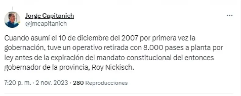 Asimismo, expuso que al momento de tomar su primer mandato en la gobernación provincial en el año 20007 le tocó vivir el "operativo retirada" de Roy Nikisch que contó con "8000 pases a planta por ley".