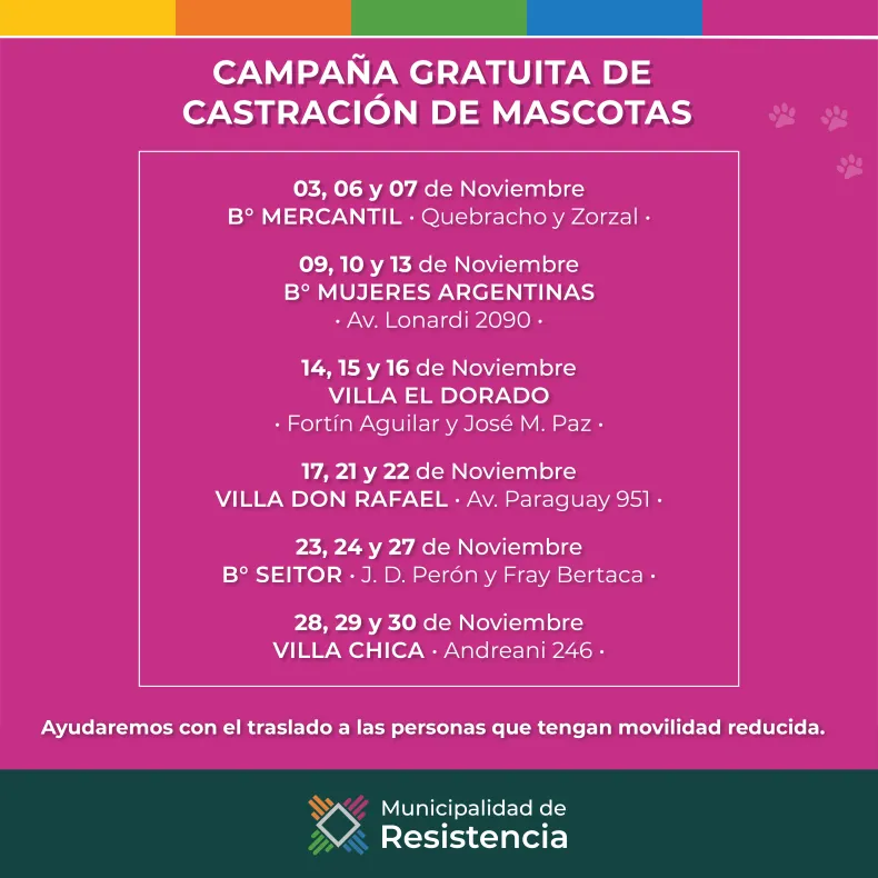 Organizado por la Municipalidad de Resistencia, el programa "Mi Mascota" continuará ofreciendo castración gratuita itinerante durante todo noviembre en diferentes barrios de la capital chaqueña. En cada operativo el quirófano móvil se establecerá desde las 8 de la mañana, mientras que los turnos de atención serán expedidos a los vecinos y vecinas por orden de llegada.