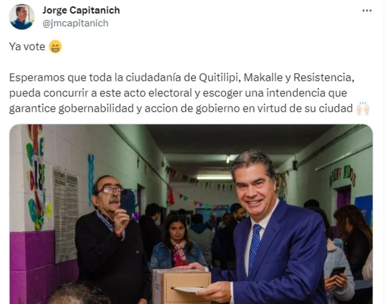 El gobernador, a través de su cuenta personal de X (antes Twitter) expresó: "Ya voté" y agregó: "Esperamos que toda la ciudadanía de Quitilipi, Makalle y Resistencia, pueda concurrir a este acto electoral y escoger una intendencia que garantice gobernabilidad y acción de gobierno en virtud de su ciudad".
