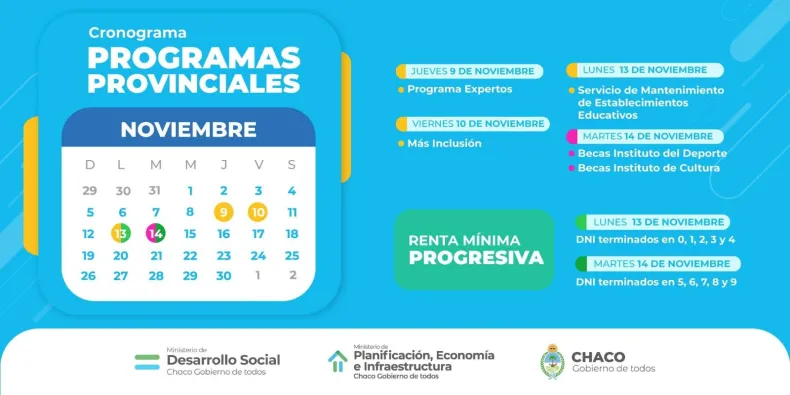 - Renta Mínima Progresiva: El lunes 13 de noviembre (DNI terminados en 0,1,2,3y 4); martes 14 de noviembre (DNI terminados en 5,6,7,8 y 9).