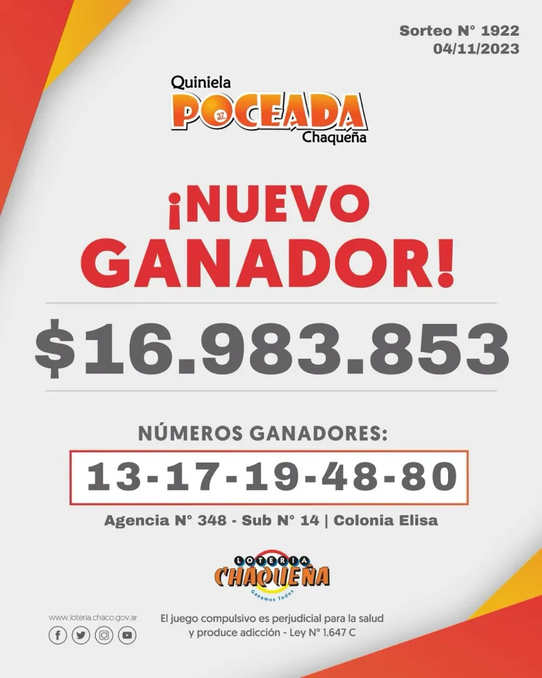 Se trató del sorteo número 1922 de la Poceada Chaqueña y en esta ocasión el ganador recibió un total de $ 16.983.853.