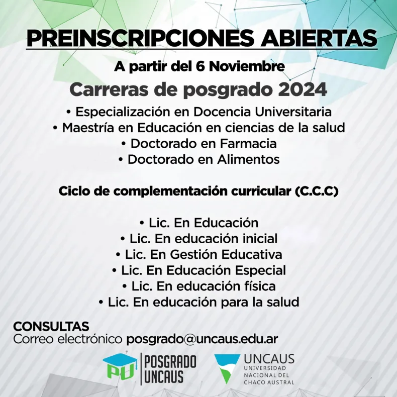 La Universidad Nacional del Chaco Austral, ubicada en la ciudad de Presidencia Roque Sáenz Peña, habilitó hasta el día 12 de diciembre de 2023, las preinscripciones para cursar Ciclos de Complementación Curricular, Maestrías, Especializaciones y Doctorados. Las preinscripciones, el procedimiento para enviar los legajos digitales y los planes de estudios, deben ser consultados a través de la página web oficial: https: //posgrado.uncaus.edu.ar/