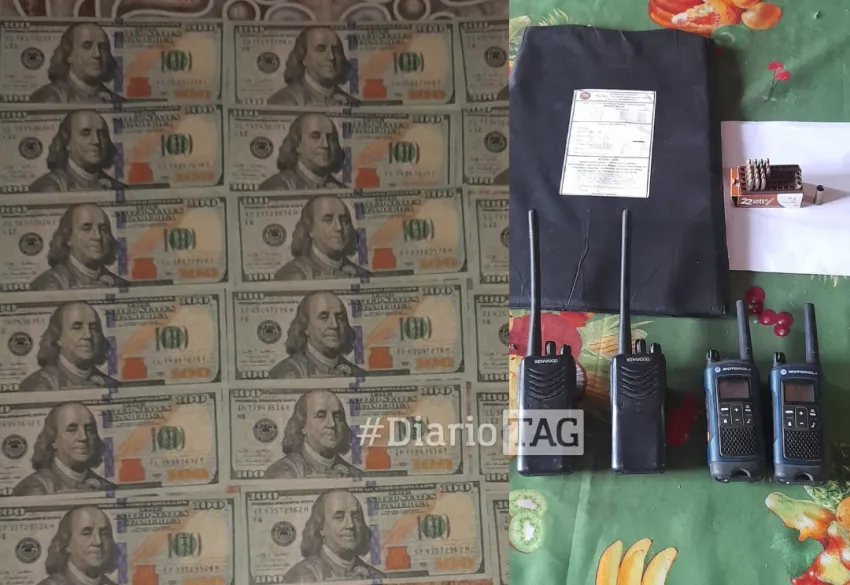 Además, incautaron otros tres billetes en el piso de la casa, presumiblemente falsos. También, secuestraron una placa balística, 18 cartuchos calibre 22 largo, tres vainas servidas del mismo calibre, una vaina servida calibre 38, cuatro radios portátiles y un cargador base.