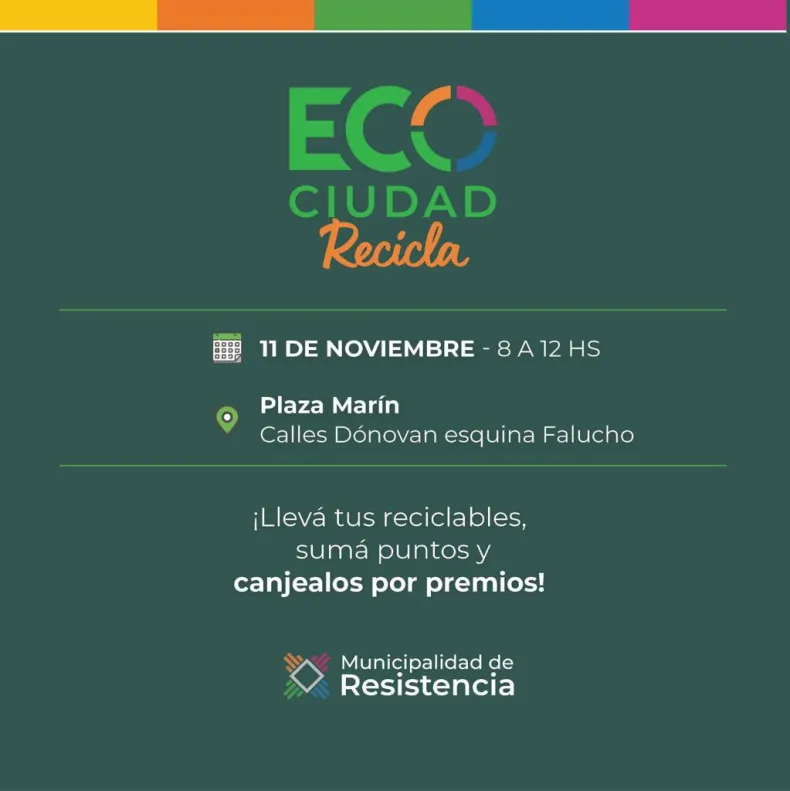 Este sábado 11 de noviembre, el programa ambiental municipal "Eco Ciudad Recicla" se presentará en la Plaza Marín, ubicada en calles Dónovan y Falucho, a partir de las 8 y hasta las 12 horas. En caso de lluvias, se suspende la jornada.