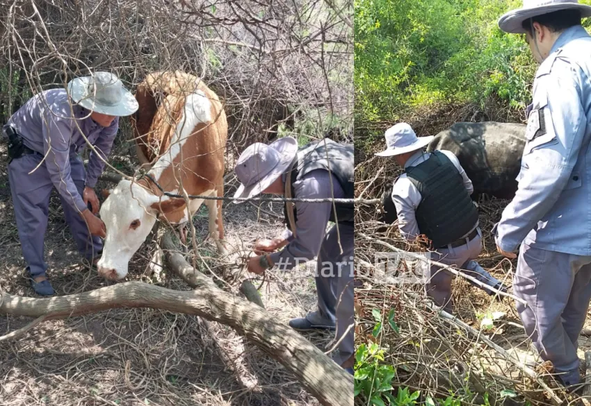 Luego, continuaron con el seguimiento de rastros, la policía no logró observar otros en la zona, por tal motivo y retomando desde el principio, son orientados hacia el cardinal Suroeste mediante rastros avanzan unos 1500 metros del último animal hallado, donde al introducirse al interior de un monte de gran vegetación observaron al segundo animal faltante, tambeado a un árbol.