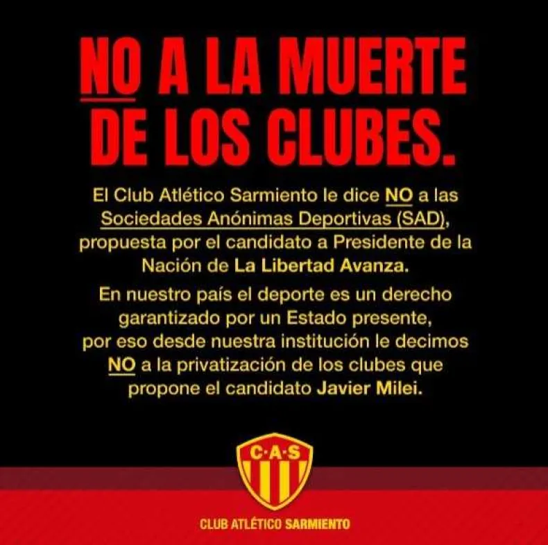 Por su parte, desde la dirigencia de Sarmiento expresaron que "en nuestro país el deporte es un derecho garantizado por un Estado presente, por eso desde nuestra institución le decimos NO a la privatización de los clubes que propone el candidato Javier Milei".