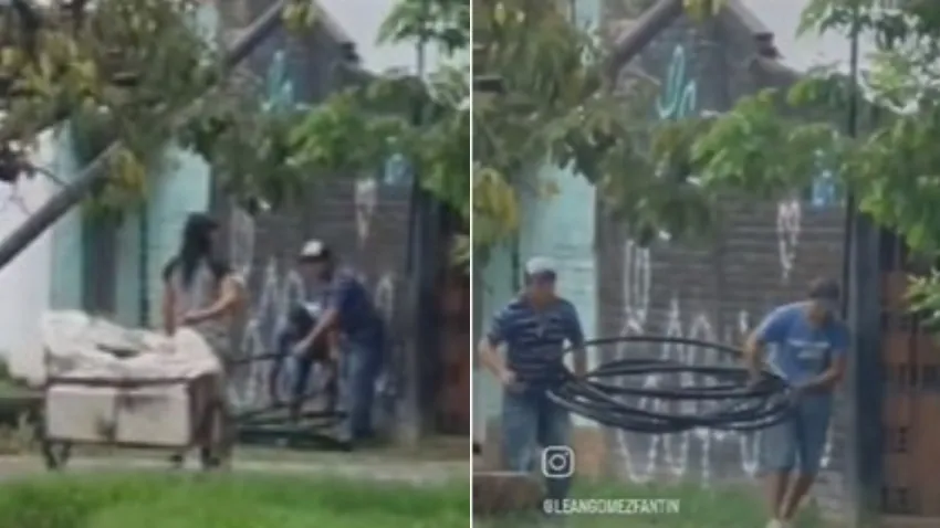 Este lunes, circuló un video de vecinos del barrio Raota de Resistencia en el cual se ve como dos hombres, aparentemente, mayores de edad roban cables de alta tensión. A la vez, se aprecia a una cómplice que cargó todo lo robado a un carrito de mano.