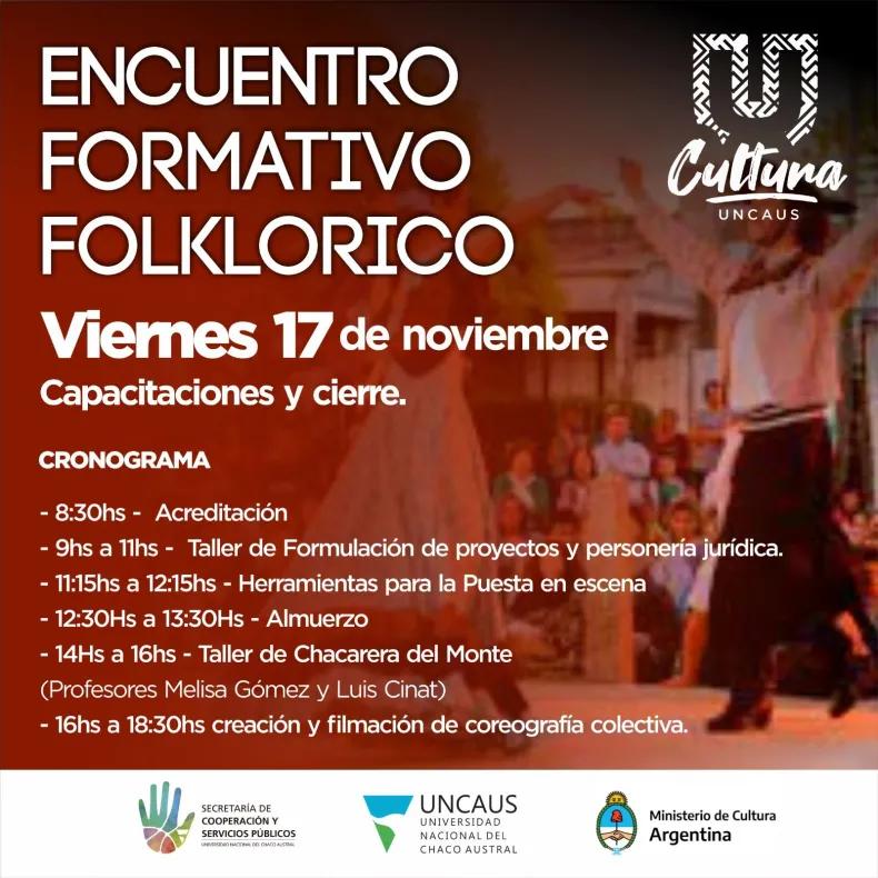 El día viernes 17 de noviembre, desde las 8:30 horas, llega al Estadio Arena de la Universidad Nacional del Chaco Austral, el Primer Encuentro Formativo Folklórico gratuito, que contará con talleres teóricos, prácticos y un gran cierre colectivo.