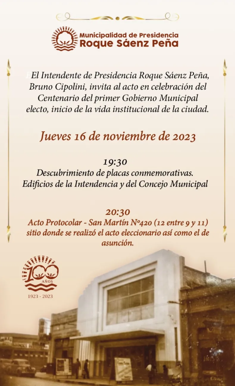 Con actos y reconocimientos en la tarde-noche de este jueves 16 de noviembre la municipalidad de Presidencia Roque Sáenz Peña conmemora el centenario del gobierno municipal.