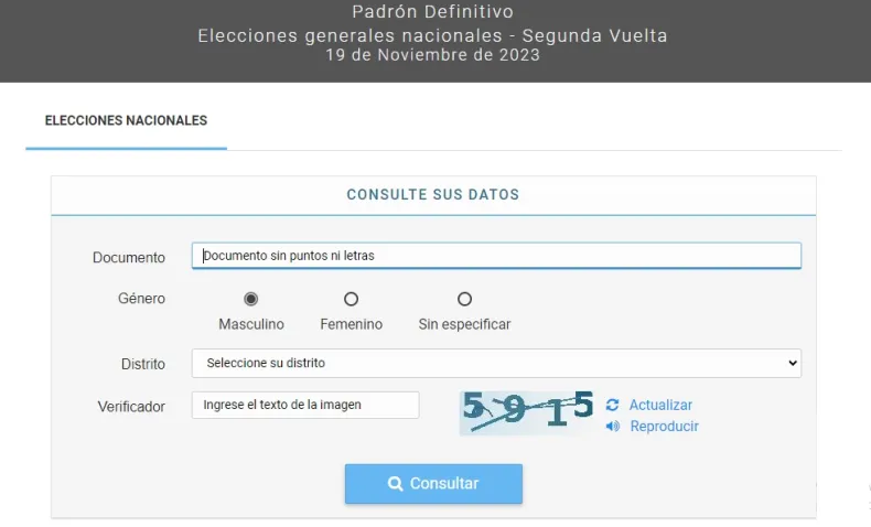 Para ello, el elector debe introducir en el sistema su número de documento, género, distrito donde vota e ingresar un código verificador. A partir de esos datos, el ciudadano conocerá el establecimiento y la mesa en que debe sufragar.