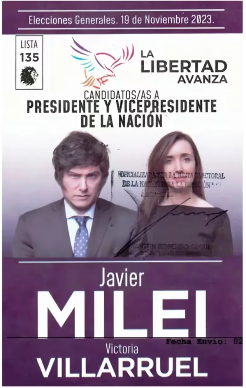 Además de Milei, en la boleta presidencial aparece la imagen de Victoria Villarruel, su compañera de fórmula y candidata a la vicepresidencia por el espacio de LLA.