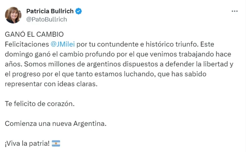Una de las que se pronunció a través de la red social "X" fue Patricia Bullrich, excandidata a la presidencia por JxC, y escribió: "Ganó el cambio. Felicitaciones Javier Milei por tu contundente e histórico triunfo".