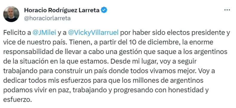 Por su parte, Horacio Rodríguez Larreta escribió en su cuenta personal de "X": "Felicito a Javier Milei y a Victoria Villarruel por haber sido electos presidente y vice de nuestro país. Tienen, a partir del 10 de diciembre, la enorme responsabilidad de llevar a cabo una gestión que saque a los argentinos de la situación en la que estamos".
