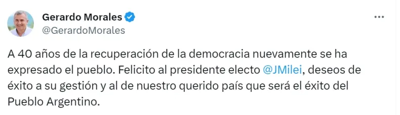 El radical Gerardo Morales fue otro de los dirigentes que se pronunció en redes sociales tras el triunfo de Milei y publicó: "A 40 años de la recuperación de la democracia nuevamente se ha expresado el pueblo".