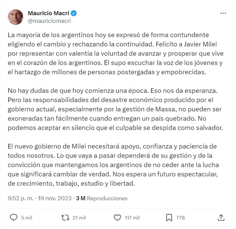 El expresidente de la Nación, Mauricio Macri, felicitó al actual mandatario electo, Javier Milei luego del triunfo electoral conseguido en la segunda vuelta presidencial. Además, en un claro mensaje de apoyo expresó a la ciudadanía: "El nuevo Gobierno necesitará apoyo, confianza y paciencia".