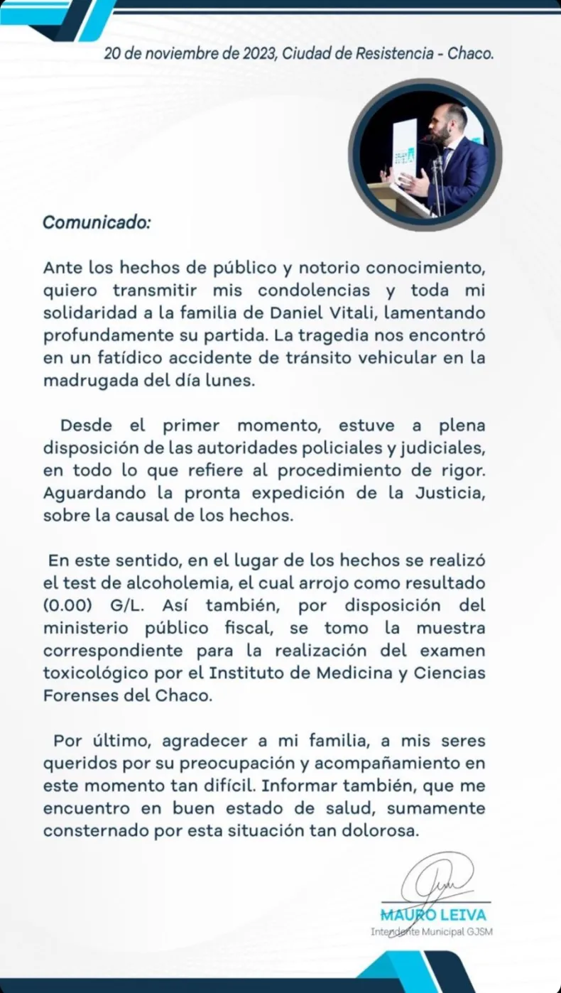 Ante los hechos de público y notorio conocimiento, quiero transmitir mis condolencias y toda mi solidaridad a la familia de Daniel Vitali, lamentando profundamente su partida. La tragedia nos encontró en un fatídico accidente de tránsito vehicular en la madrugada del día lunes.