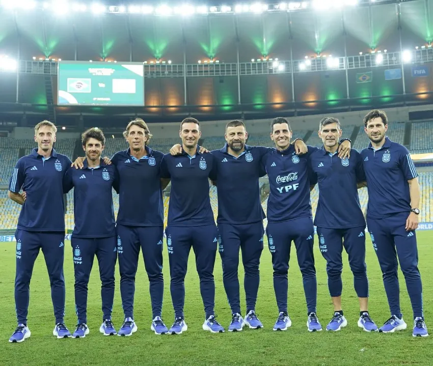 Todos los integrantes del cuerpo técnico de la Selección, con Pablo Aimar, Walter Samuel y Roberto Ayala entre ellos, se sacaron una foto en el campo de juego del Maracaná.