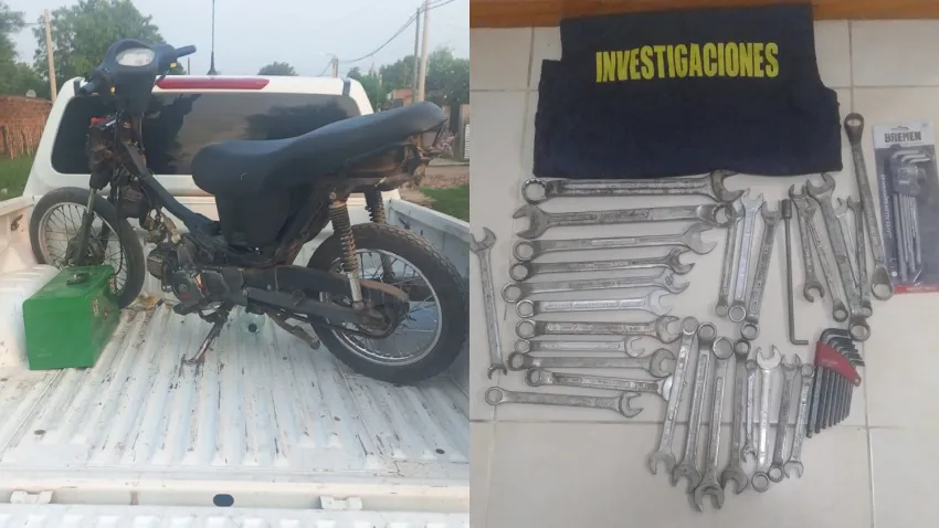 Además, se recuperó una motocicleta tipo 110cc, sin carenados y con ambas llantas a rayos. Tras confirmar con la denuncia inicial, tanto las herramientas como la motocicleta coincidieron con lo sustraído. Estos objetos fueron trasladados a la sede policial para su resguardo y para los fines legales correspondientes.