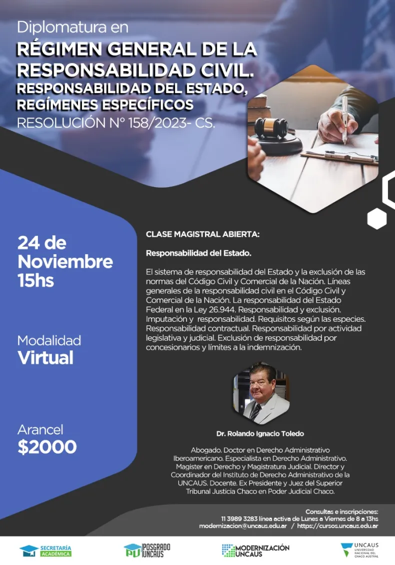 La Universidad Nacional del Chaco Austral, en el marco de la Diplomatura en Régimen General de la Responsabilidad Civil que está dictando la institución educativa, llevará a cabo una clase magistral abierta sobre la "Responsabilidad del Estado", a cargo del expresidente y juez del Superior Tribunal de Justicia de la provincia de Chaco, Rolando Ignacio Toledo.