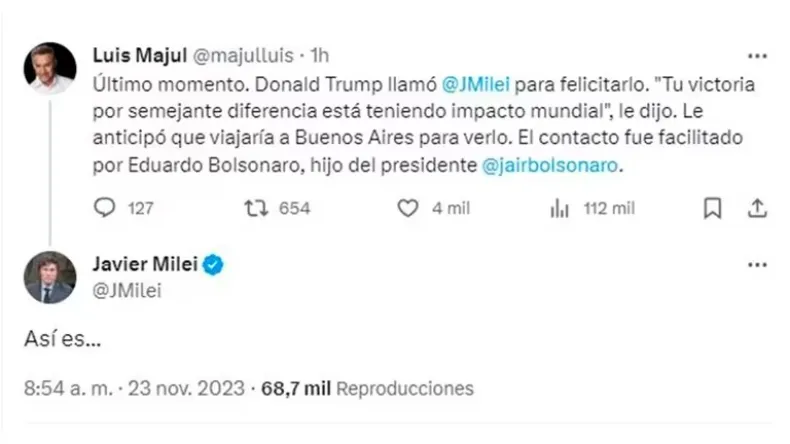 "Último momento. Donald Trump llamó @JMilei para felicitarlo. "Tu victoria por semejante diferencia está teniendo impacto mundial", le dijo. Le anticipó que viajaría a Buenos Aires para verlo. El contacto fue facilitado por Eduardo Bolsonaro, hijo del presidente @jairbolsonaro", escribió Majul esta mañana, a lo que el presidente electo respondió: "Así es...".