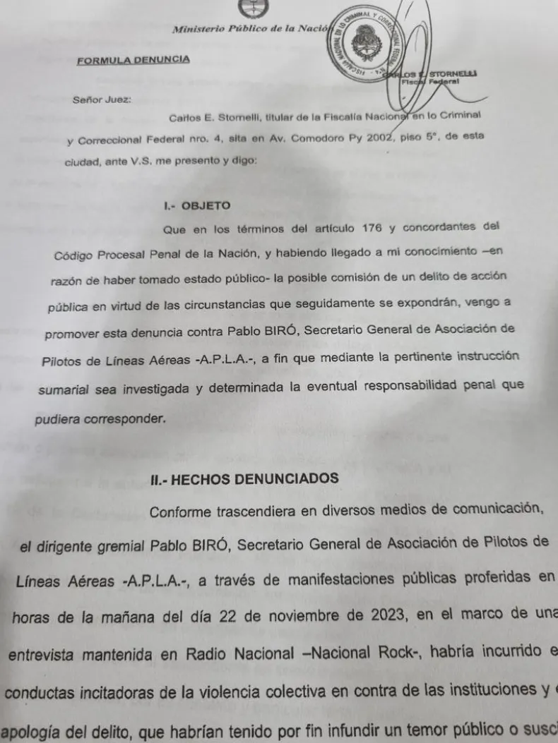 El fiscal Carlos Stornelli denunció este jueves al titular de la Asociación de Pilotos de Líneas Aéreas, Pablo Biró, por su dura advertencia sobre la postura que tomarán los sindicatos si el presidente electo Javier Milei avanza en la privatización de la aerolínea de bandera.
