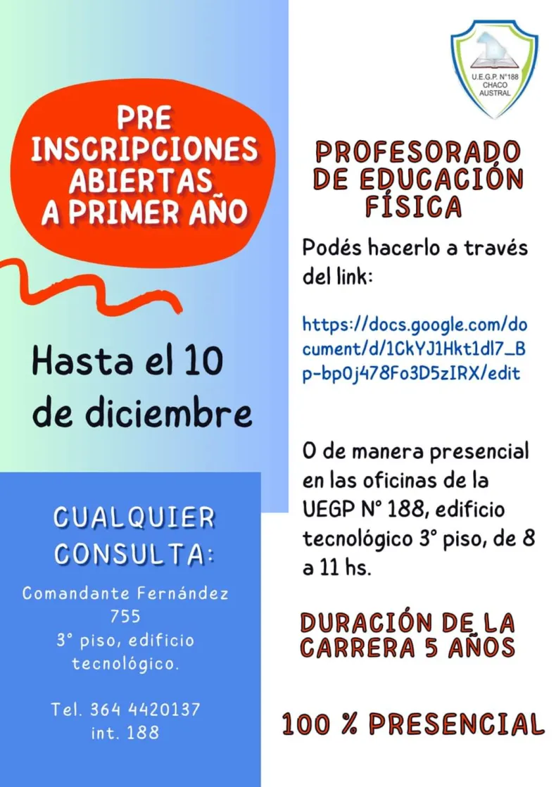 La Universidad Nacional del Chaco Austral (UNCAUS) informa que se encuentran abiertas las preinscripciones para el Profesorado de Educación Física de la U.E.G.P. Nº 188 "Chaco Austral", hasta el día 10 de diciembre de 2023.