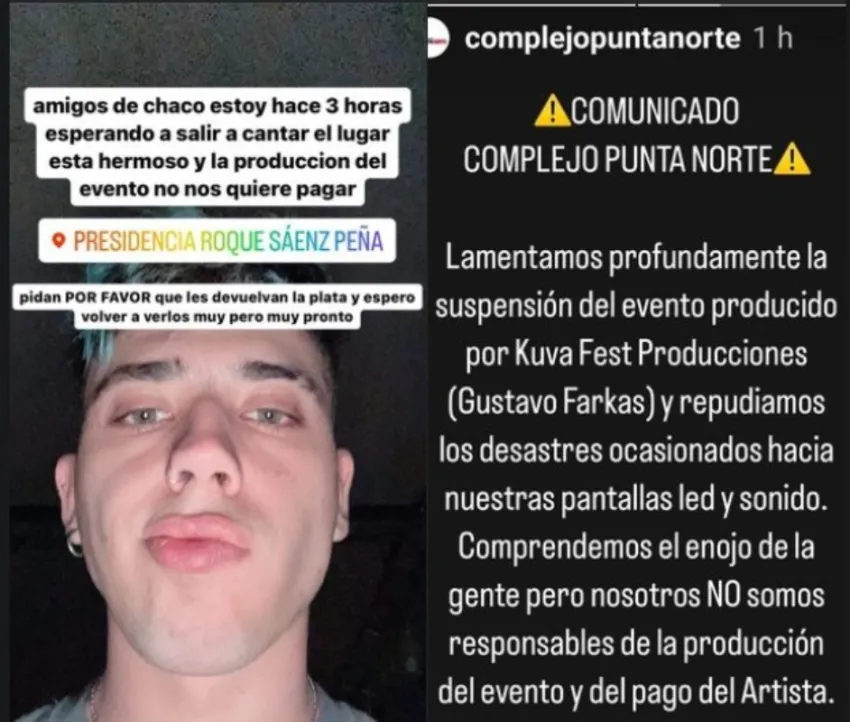 El propio artista también utilizó las redes sociales para expresar su malestar, indicando: "Amigos de Chaco, llevo tres horas esperando para salir a cantar, el lugar está hermoso, pero la producción del evento se niega a pagar", afirmó el joven.