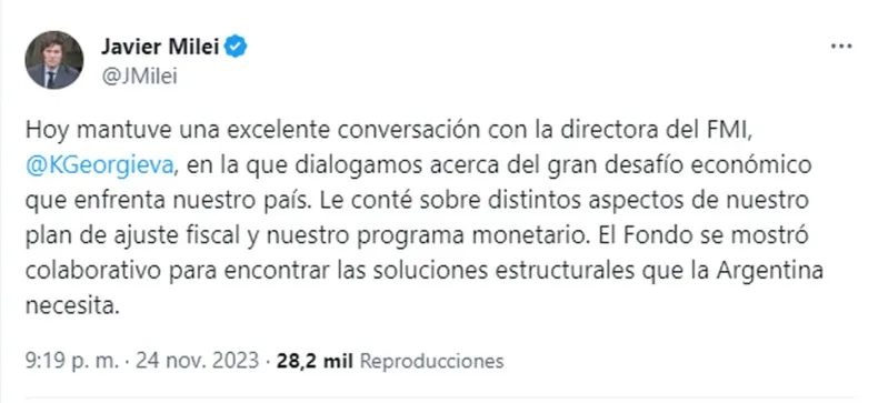 "Hoy mantuve una excelente conversación con la directora del FMI, Kristalina Georgieva, en la que dialogamos acerca del gran desafío económico que enfrenta nuestro país. Le conté sobre distintos aspectos de nuestro plan de ajuste fiscal y nuestro programa monetario", aseguro el líder de la Libertad Avanza.
