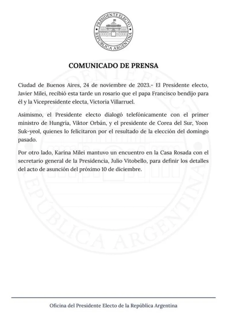 Según explicó la oficina de prensa de Milei, Francisco detalló que el rosario fue bendecido tanto para Milei como para la vicepresidenta electa, Victoria Villarruel.