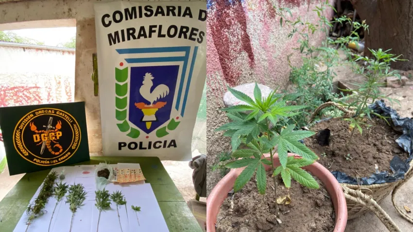 En la casa del barrio Jardín incautaron un frasco de vidrio trasparente con cogollos de marihuana con un peso de 31 gramos, dos recipientes plásticos con semillas que pesaban 9 gramos, seis plantas con hojas tipo organolépticas propias del cáñamo, $ 9.000 pesos en efectivo y un celular. Dos ciudadanos fueron demorados.