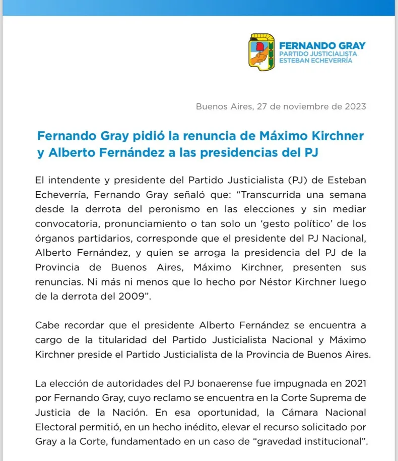 Tras la derrota electoral que sufriera el peronismo en el balotaje a manos de Javier Milei, comienza crujir el actual oficialismo y la primera señal de la crisis la recogió el intendente y presidente del Partido Justicialista (PJ) de Esteban Echeverría, Fernando Gray quien solicitó la renuncia de Alberto Fernández como presidente del PJ Nacional y de Máximo Kirchner como titular del PJ de la Provincia de Buenos Aires.
