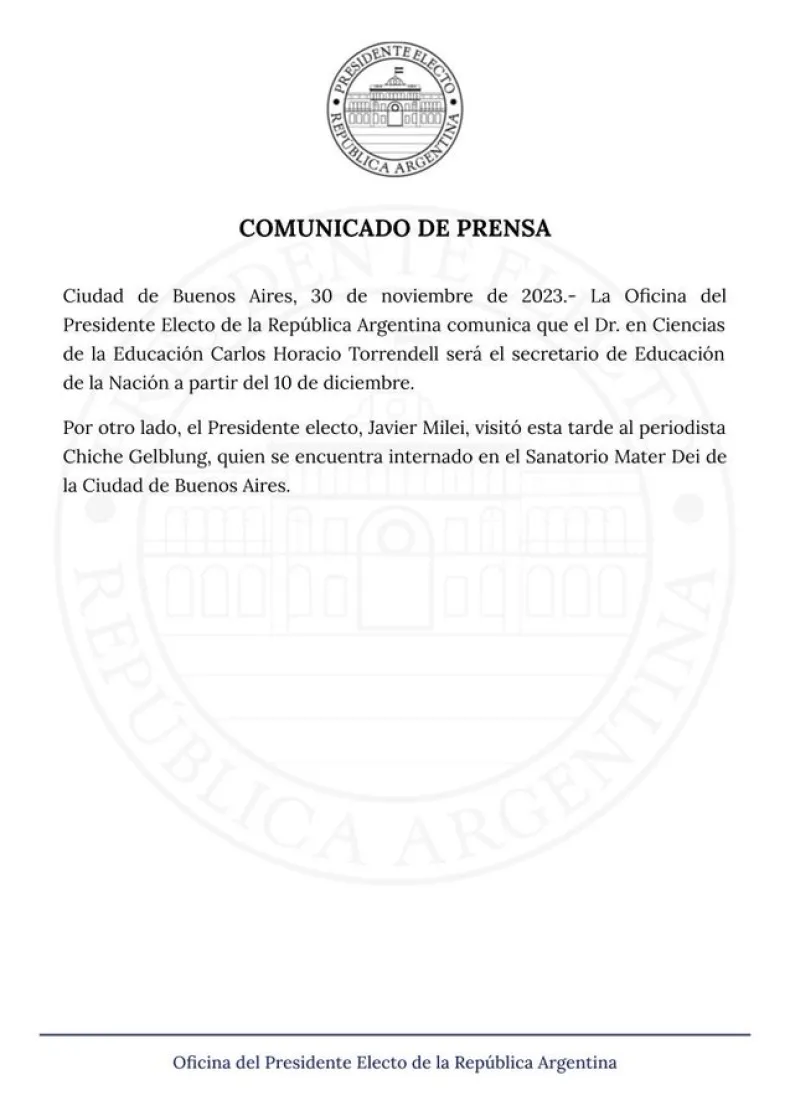 A 10 días de asumir la presidencia, Javier Milei, designó a su secretario de Educación y será Carlos Torrendell. La información fue confirmada esta tarde, a través de un comunicado oficial emitido desde la oficina del mandatario electo.