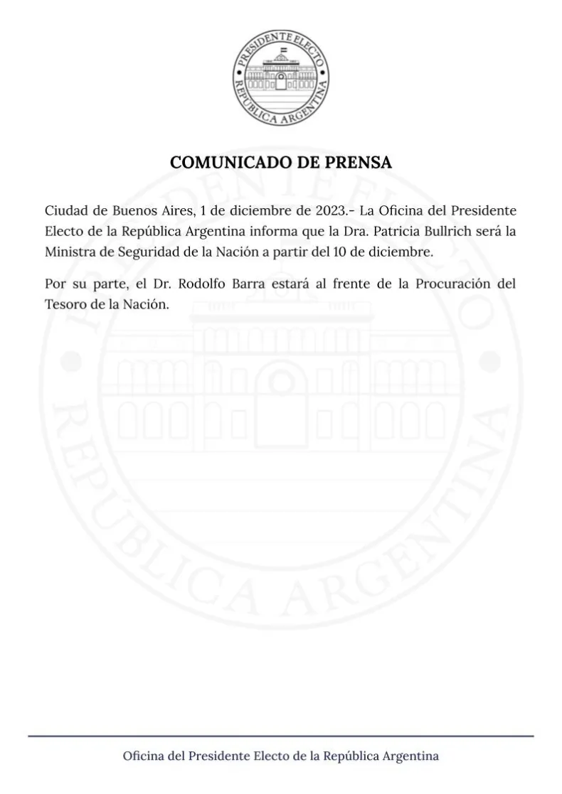 "La Oficina del Presidente Electo de la República Argentina informa que la Dra. Patricia Bullrich será la ministra de Seguridad de la Nación a partir del 10 de diciembre", precisó el comunicado.