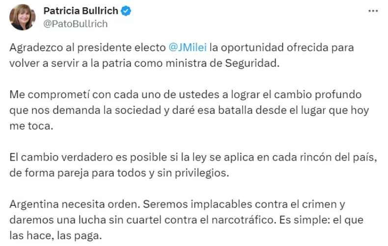 Patricia Bullrich, tras confirmarse la noticia publicó un mensaje en su cuenta de la red social X (ex Twitter) en el que destacó que serán "implacables contra el crimen" y darán "una lucha sin cuartel contra el narcotráfico".