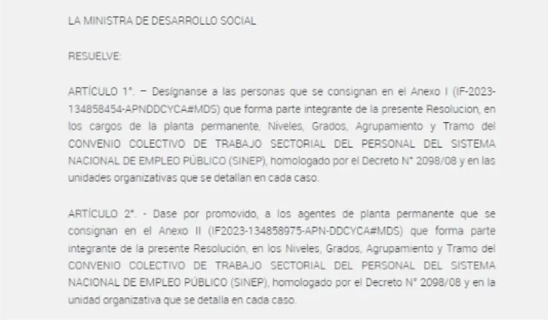 Según consta en la Resolución 2323/2023, se suman dos agentes como Analistas de Administración y Gestión de Personal. Mientras que en la Resolución 2345/2023, son cinco los empleados confirmados como Especialistas de Planificación e Implementación de Políticas Públicas con orientación en Estrategias de Inclusión Social.