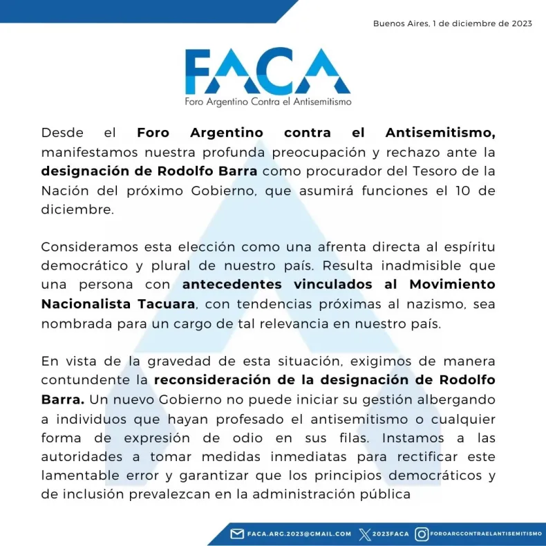El Foro Argentino Contra el Antisemitismo rechazó la designación del exministro Rodolfo Barra al frente de la Procuración del Tesoro durante el próximo Gobierno de Javier Milei y, en un comunicado difundido desde la organización le exigieron al presidente electo la reconsideración del nombramiento al argumentar que el jurista tiene "antecedentes vinculados con tendencias próximas al nazismo".