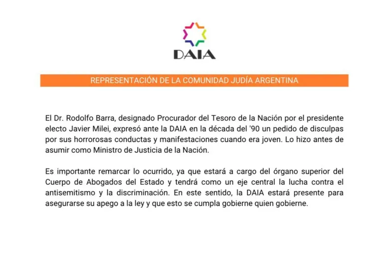 Sin embargo, la Delegación de Asociaciones Israelitas Argentinas (DAIA) también emitió un comunicado en el que aseguran que "el Dr. Rodolfo Barra expresó ante la DAIA en la década del ‘90 un pedido de disculpas por sus horrorosas conductas y manifestaciones cuando era joven. Lo hizo antes de asumir como Ministro de Justicia de la Nación".