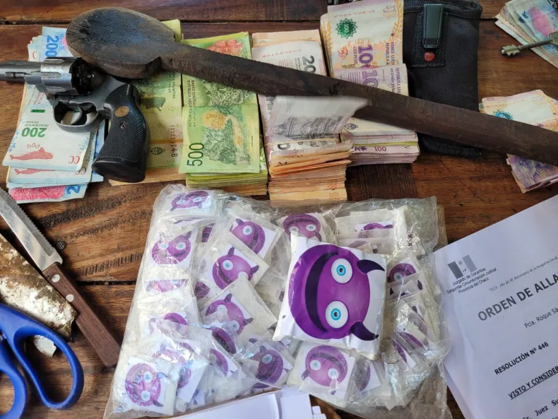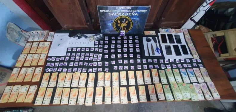 Por su parte, en el domicilio situado en calle sin número del Parque Industrial, procedieron a la detención del popular líder de esta red, un hombre de 48 años y se incautó un paquete cuadrado identificado con el sticker "diablito" conteniendo 79 gramos de cocaína, 120 paquetitos transparentes cuadrados, todos con stickers individuales, con la misma sustancia arrojando pesaje de 189 gramos, un celular, dinero en efectivo por la suma de $ 542.250, dos cuchillos y una tijera con restos de sustancia, recortes de bolsas de polietileno y un arma de fuego tipo revólver calibre 22 cargado con 6 cartuchos.