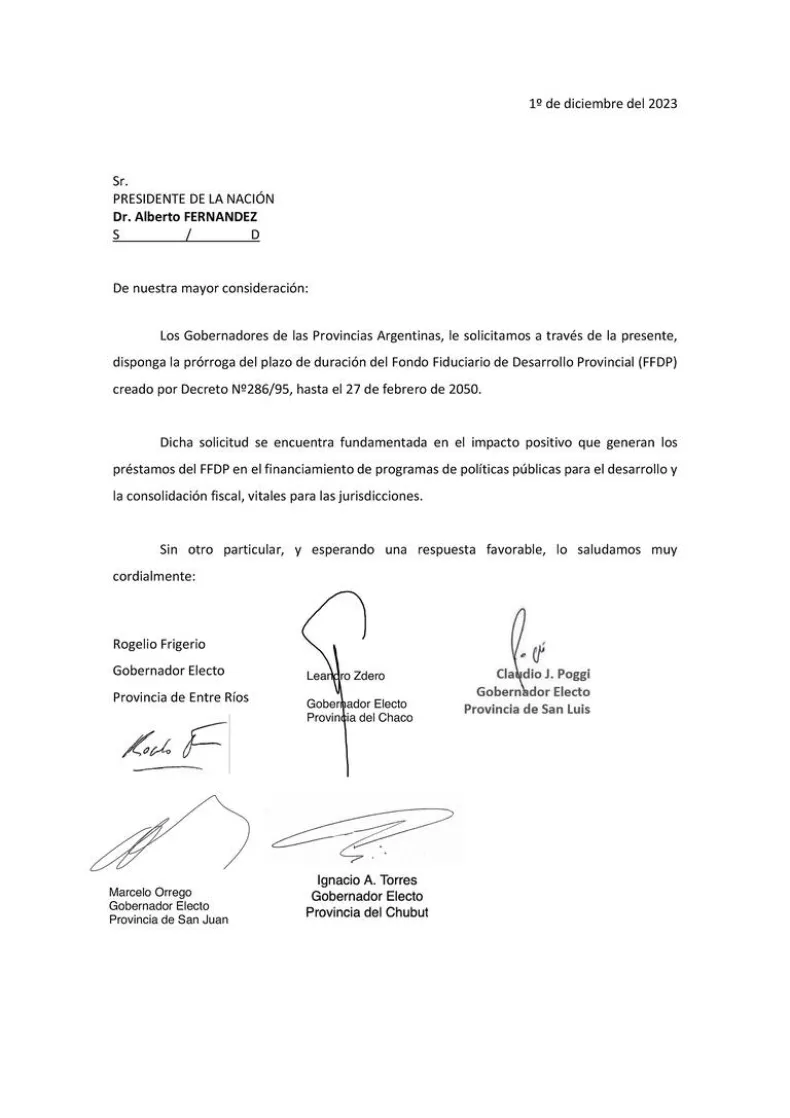 En sus fundamentos, los gobernadores expresaron que la petición se basa "en el impacto positivo que generan los préstamos del FFDP en el financiamiento de programas de políticas públicas para el desarrollo y la consolidación fiscal, vitales para las jurisdicciones".