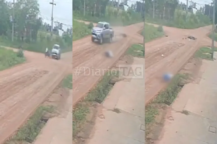 Fue allí que el motociclista sufrió un fuerte impacto con una camioneta gris, que lo tiró de la moto. En las imágenes difundidas se puede ver el momento W. N. A. de 27 años sale despedido de su vehículo y termina rodando por la calle de tierra.