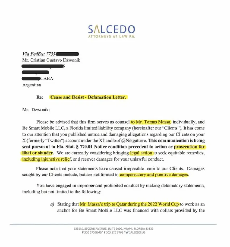 "¿Malena, por qué me llega una carta en inglés, y desde un poderoso estudio de abogados radicado en EE.UU.? ¿La familia del Presidente que iba a manejar la Argentina no confía en la Justicia de su propio país? ¿La familia del Presidente Nacional y Popular me envía una carta documento en inglés y desde Miami? ¿Malena, por qué soy perseguido judicialmente por opinar?" continuó en referencia del escrito de la firma Salcedo Attorneys at Law, P.A