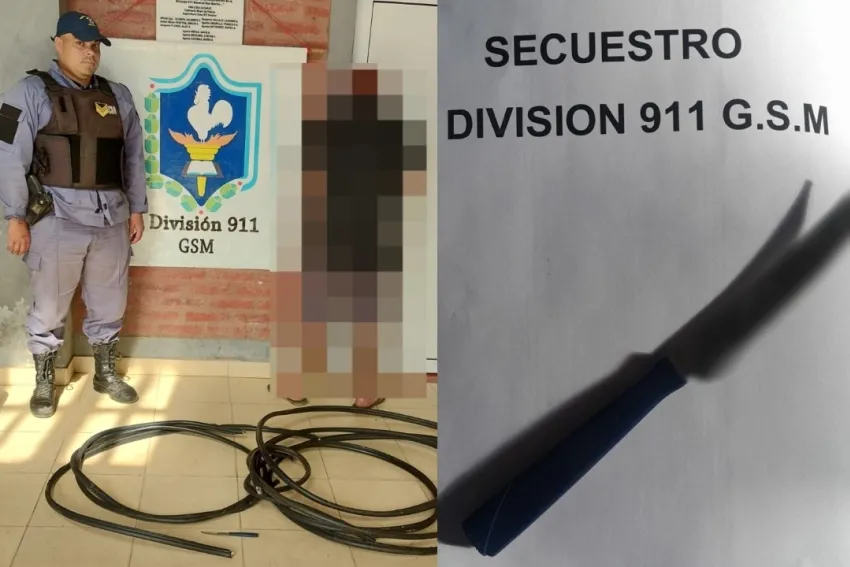 Estos transportaban casi 10 metros de cables de telefonía, que habían sido robados momentos antes en el barrio 9 de Julio. En poder del joven, tenía un cuchillo tipo serrucho Tramontina.