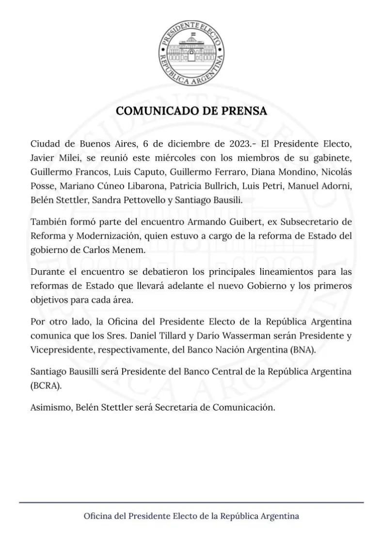 Por otro lado, la Oficina del Presidente Electo de la República Argentina comunica que los Sres. Daniel Tillard y Dario Wasserman serán Presidente y Vicepresidente, respectivamente, del Banco Nación Argentina (BNA).