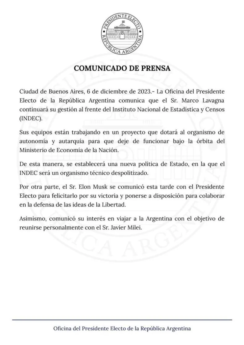 A través de un comunicado oficial, confirmaron la continuidad de Lavagna. "Se establecerá una nueva política de Estado, en la que el INDEC será un organismo técnico despolitizado", reza el texto.